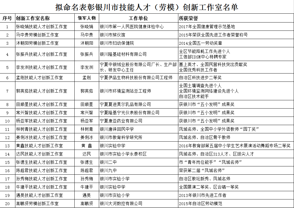 命名表彰银川市技能人才(劳模)创新工作室名单公示